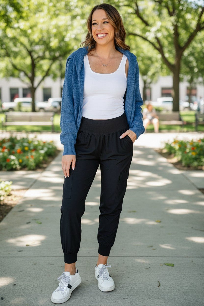 The Cargo Jogger Pants in black merge utility with contemporary style through functional cargo detailing and a modern jogger silhouette. The high-waist design flatters and elongates, while the polyester and spandex blend delivers exceptional stretch for unrestricted movement and all-day comfort. Practical pockets and tapered ankles complete the refined aesthetic. Perfect for casual outings or elevated loungewear, these pants transition seamlessly across occasions with effortless sophistication and functional design.
