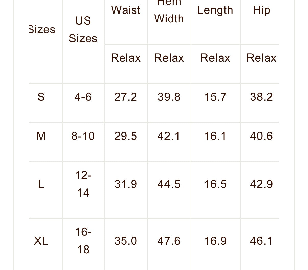 Size L (inch) : Waist= 31.59 ; Hips= 42.51 ; Length= 16.38