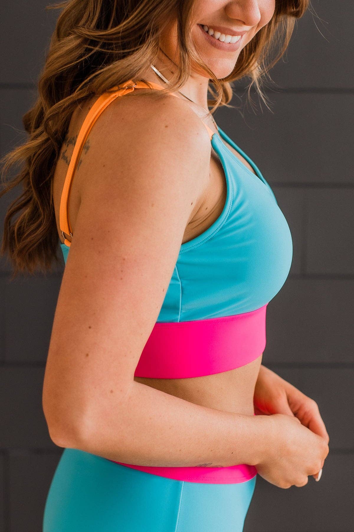 - Colors: Blue, Bright Pink, and Orange