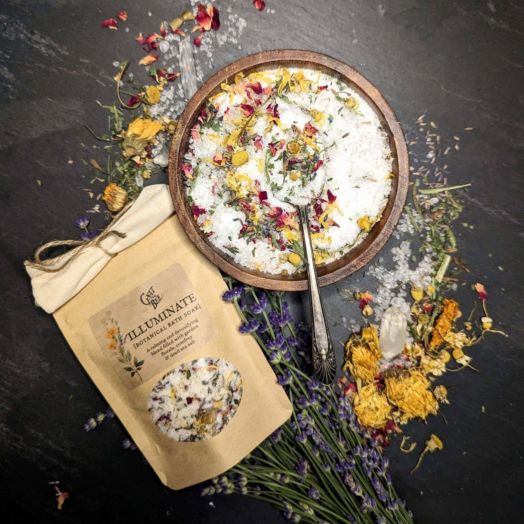 Botanical bath soak. A calming and detoxifying blend to help you unwind filled with garden florals & Dead Sea salts. Soften and moisturize skin, soothe sore muscles, relax the body & mind. Bath Ritual: For a full strength bath, add a quarter cup of mix into the bath to dissolve. Let the warmth embrace you and breathe deeply. Relax and enjoy this quiet time for yourself. *One pouch is good for 2 baths.