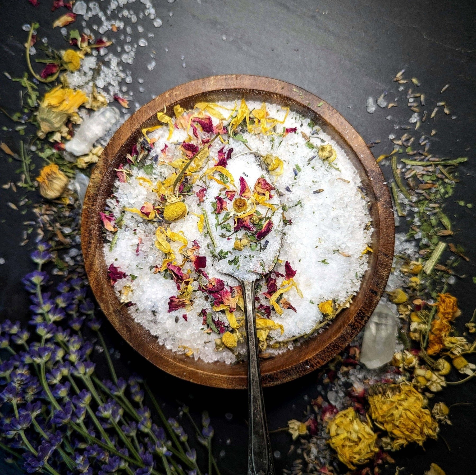 Ingredients: Magnesium sulfate (Epsom salt), Dead Sea salt, roses, lavender, chamomile, comfrey, baking soda, and essential oils of frankincense, lavender & wild sweet orange.